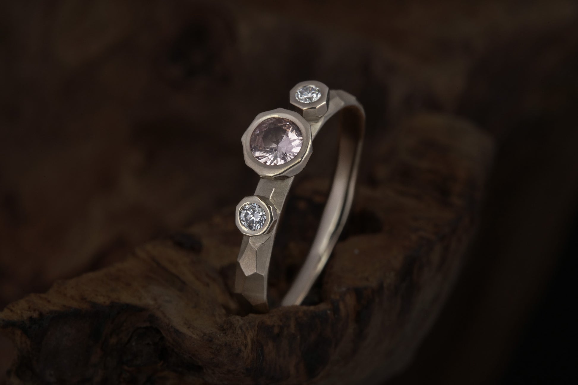 Balto aukso žiedas su brangakmeniais. Centrinis - rožinis safyras, šoniniai - labaratoriniai deimantai.