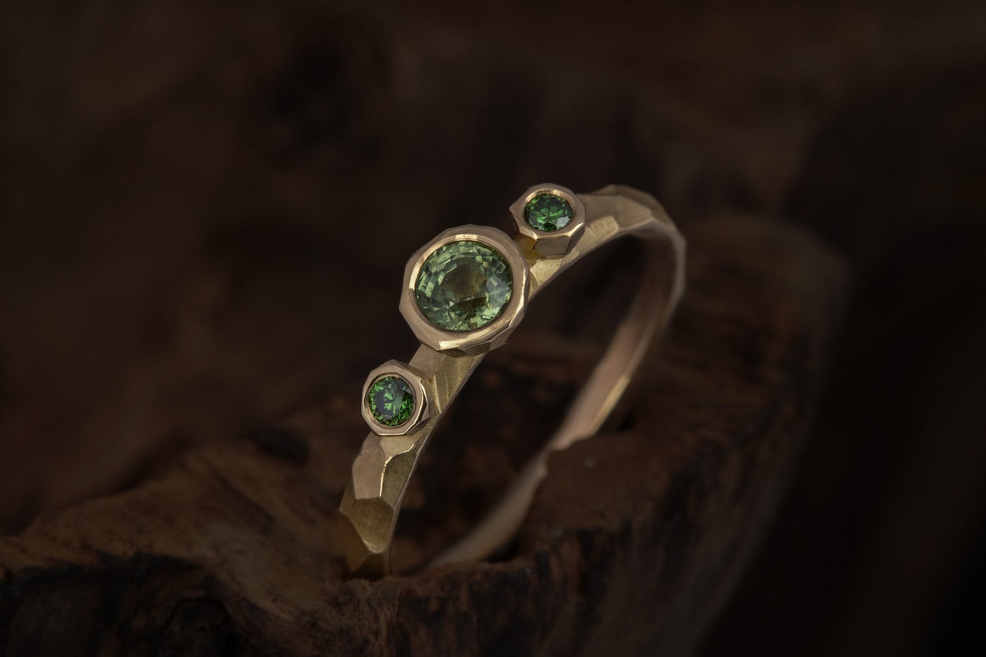 Geltono aukso žiedas su brangakmeniais. Centrinis - žalias safyras, šoniniai - žali deimantai.