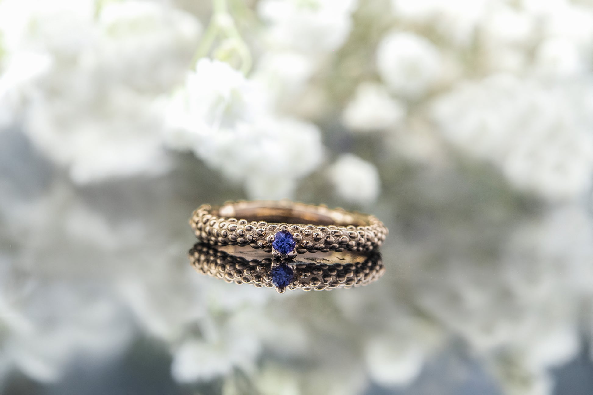 Autorinis raudono aukso žiedas su violetiniu safyru "Šerkšnas". Žiedas iš Redos Baranauskaitės kolekcijos "Pūga".