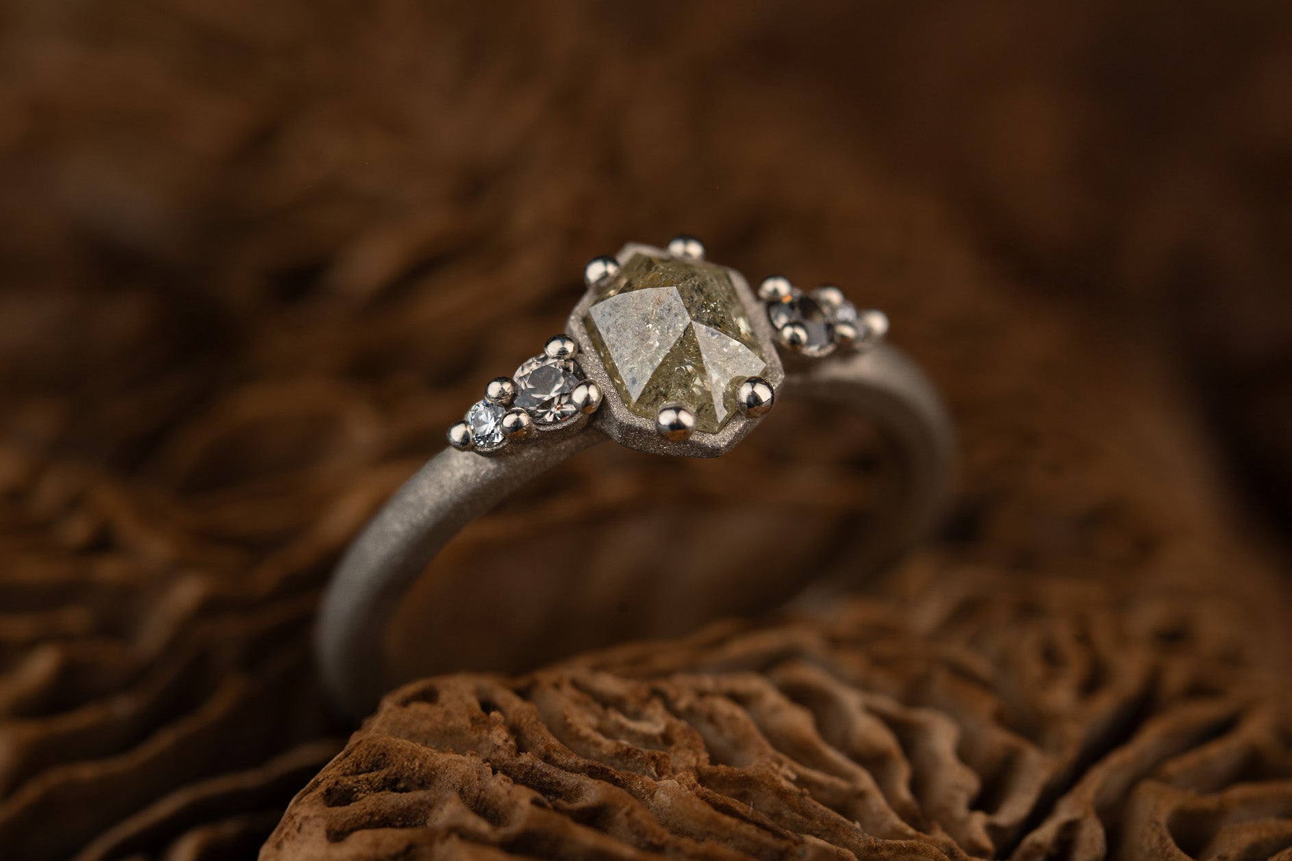 - Centrinio deimanto svoris - 0,68ct, švarumas - P3, šoniniai - 0,02ct, švarumas - VS, safyrų svoris - 0,12ct, švarumas - VS.