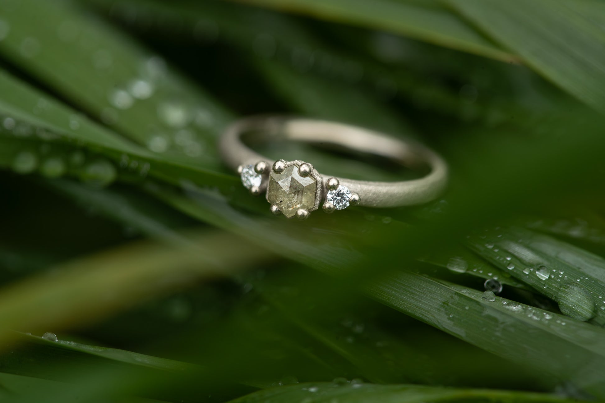 Balto aukso žiedas su "salt&pepper" deimantu ir briliantais.