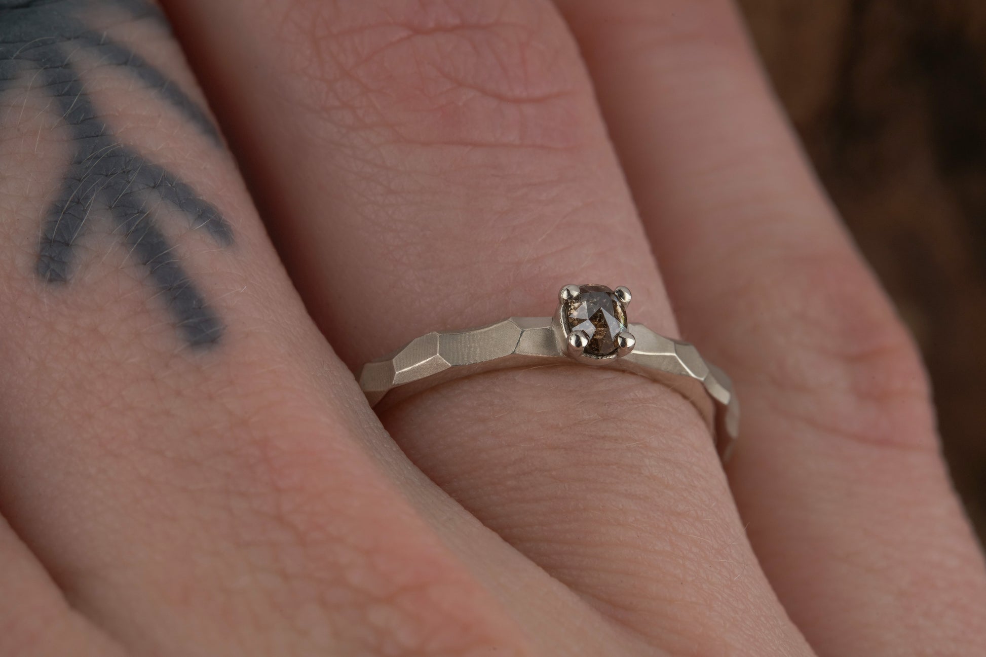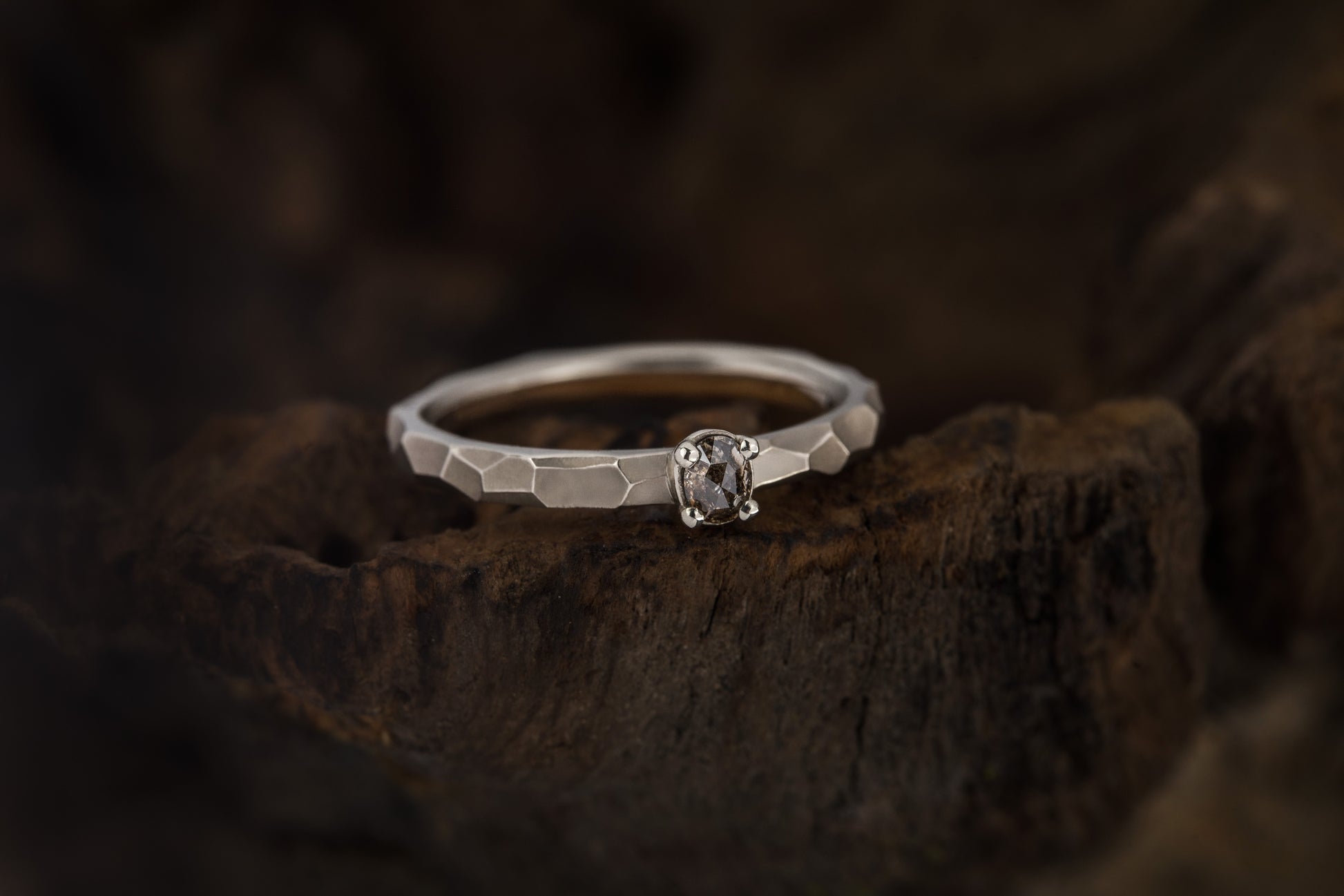 Balto aukso žiedas su „Salt & Pepper“ deimantu. Žiedo juostą puošia briaunuota, subtiliai šviesą laužanti tekstūra. Centre – ovalus „Salt & Pepper“ deimantas, išsiskiriantis natūraliu, sodriai rusvu spindesiu. Modernus ir minimalistinis pasirinkimas ieškantiems žiedo sužadėtuvėms.