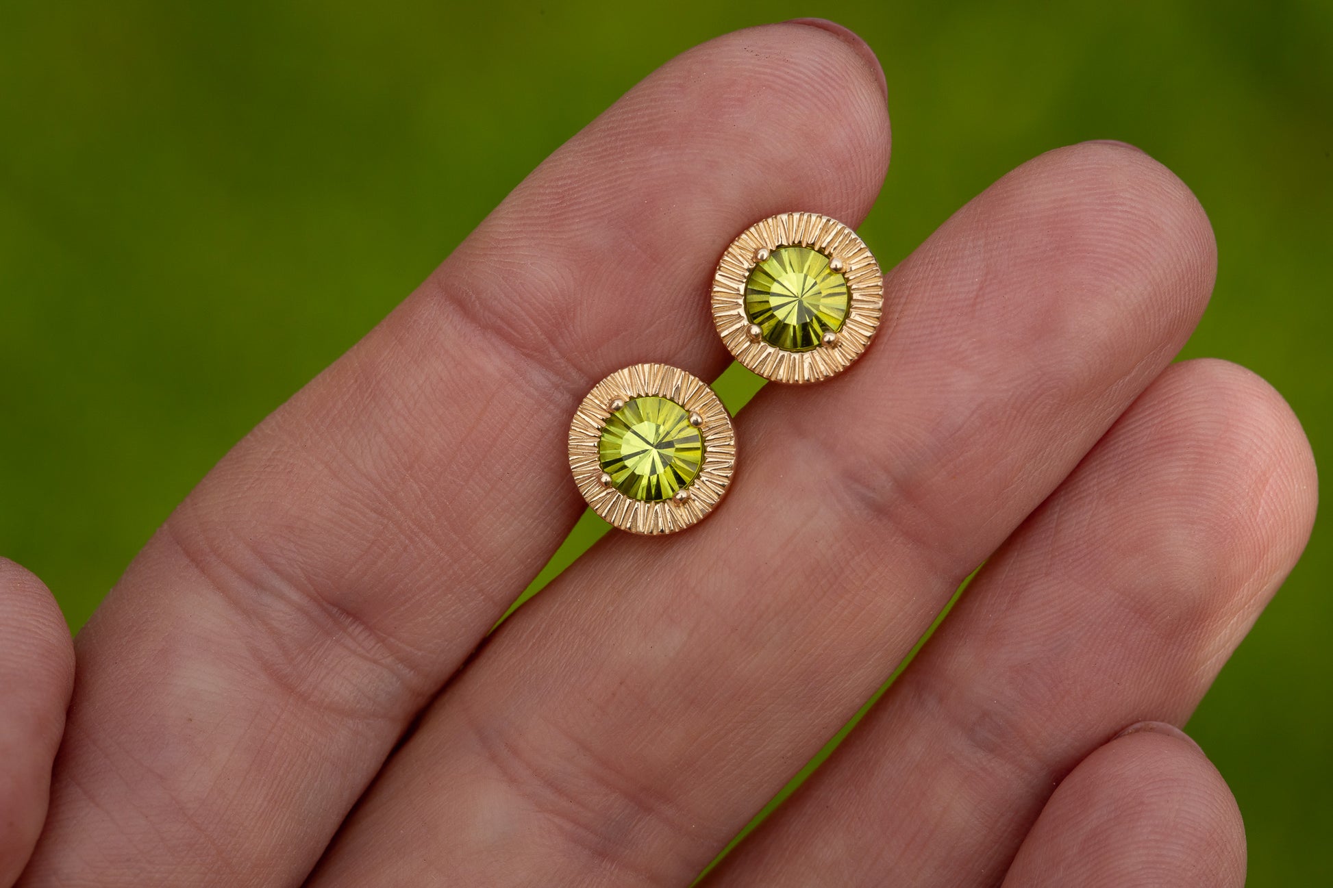 Geltono aukso auskarai su įspūdingo šlifavimo peridotais.
