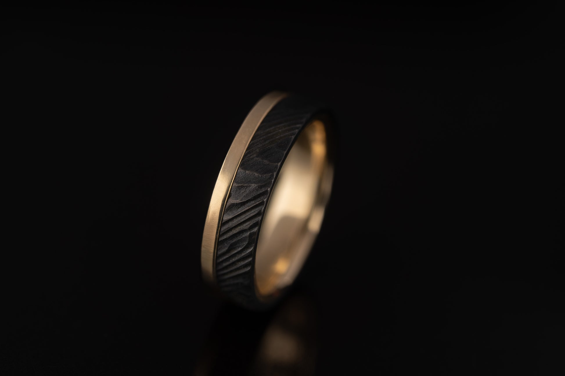 Juodinto titano ir geltono aukso žiedas. Titaninė žiedo dalis yra puošta medienos tekstūra.