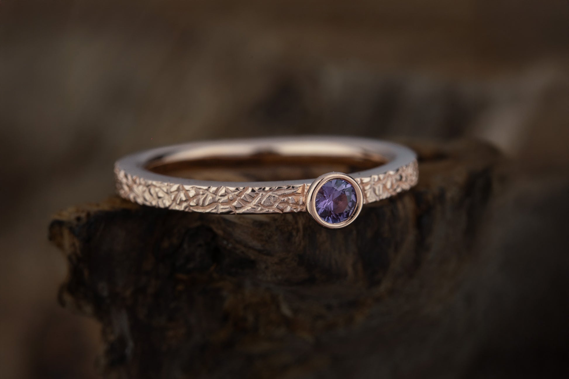 Raudono aukso žiedas su safyru. Žiedo juostą puošia smulki tektūra.