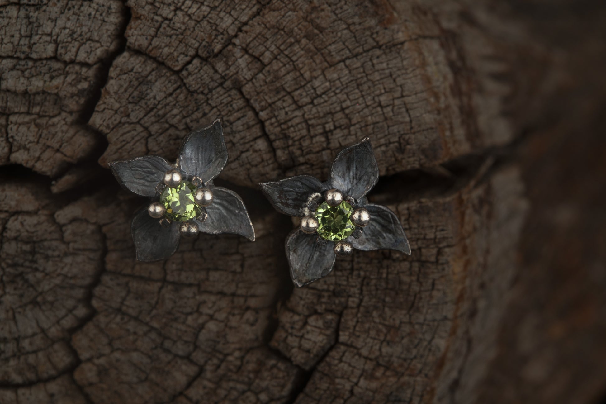 Sidabriniai auskarai "Gėlės" su žaliais turmalinais. Auskarų autorė - Aušra Jakutienė.