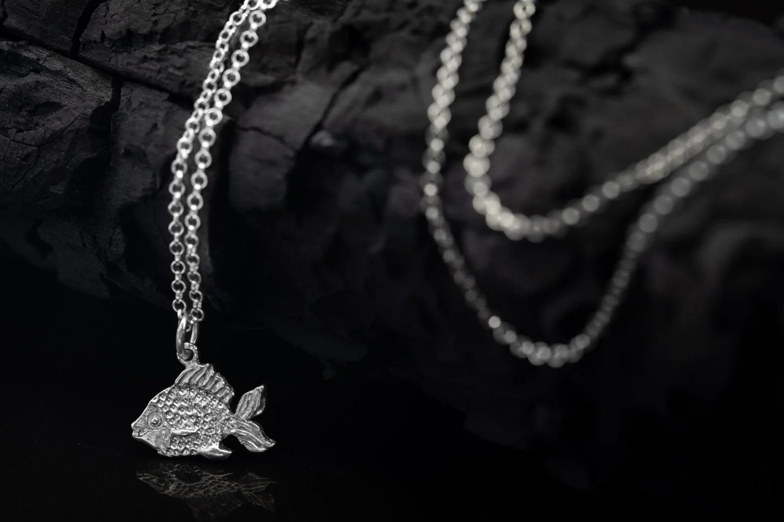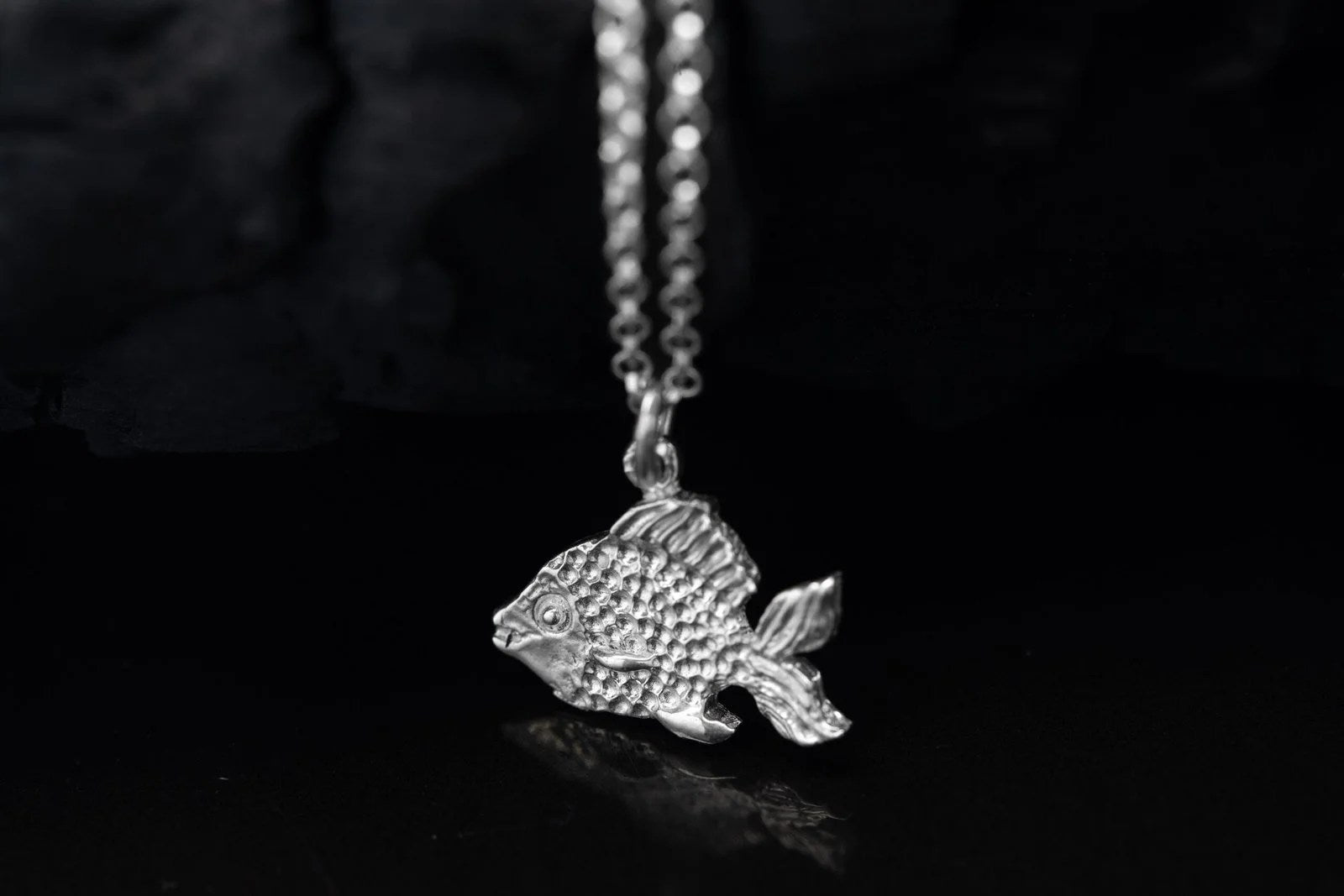Sidabrinis pakabukas "Žuvis". Itin detalus, su žvynų tekstūra ir ryškiomis pelekų linijomis, puikus pasirinkimas gamtos ir jūros motyvų mylėtojams. Autorė: Aušra Jakutienė
