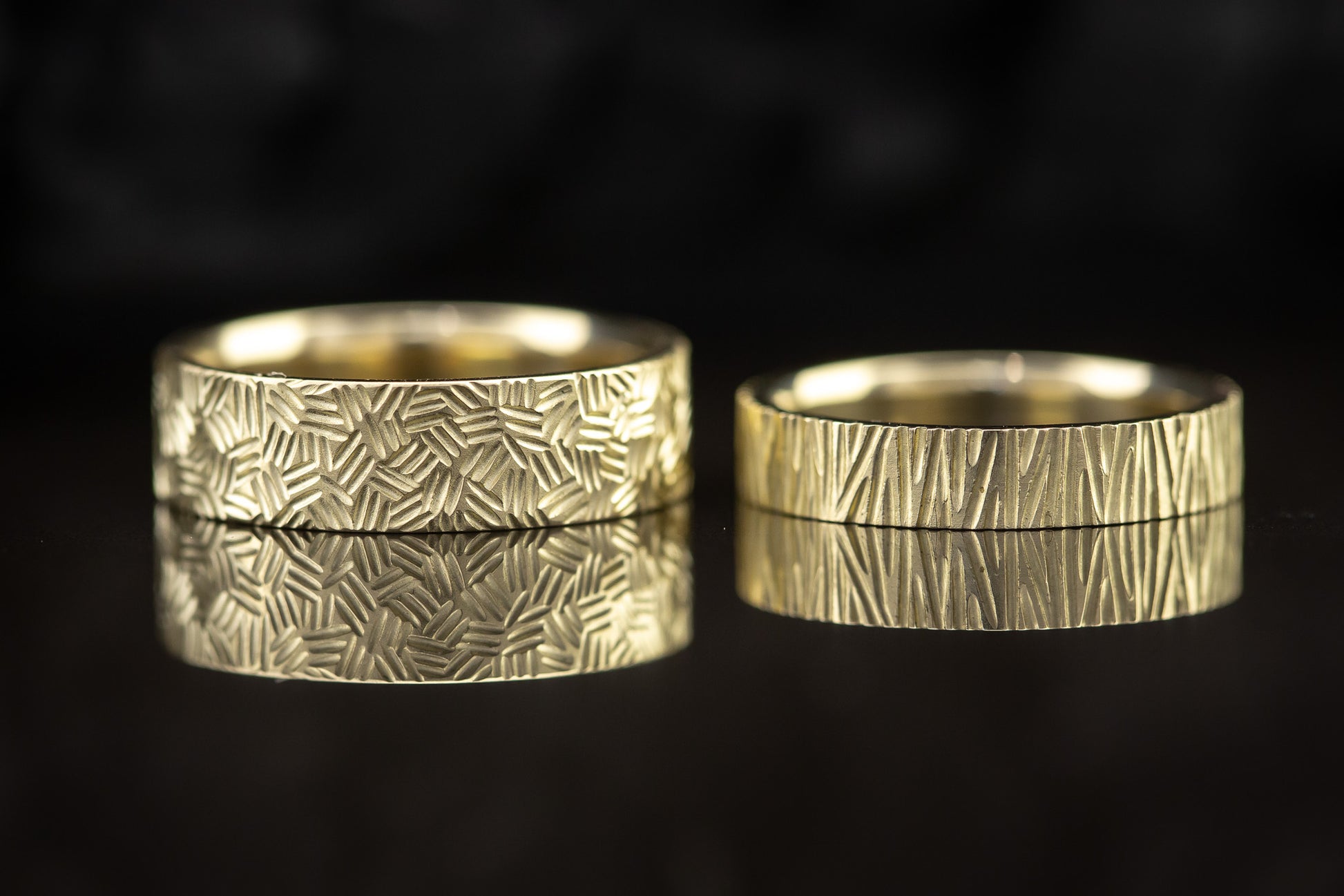 Skirtingi vestuviniai žiedai iš geltono aukso. Žiedus puošia raižyta tekstūra.