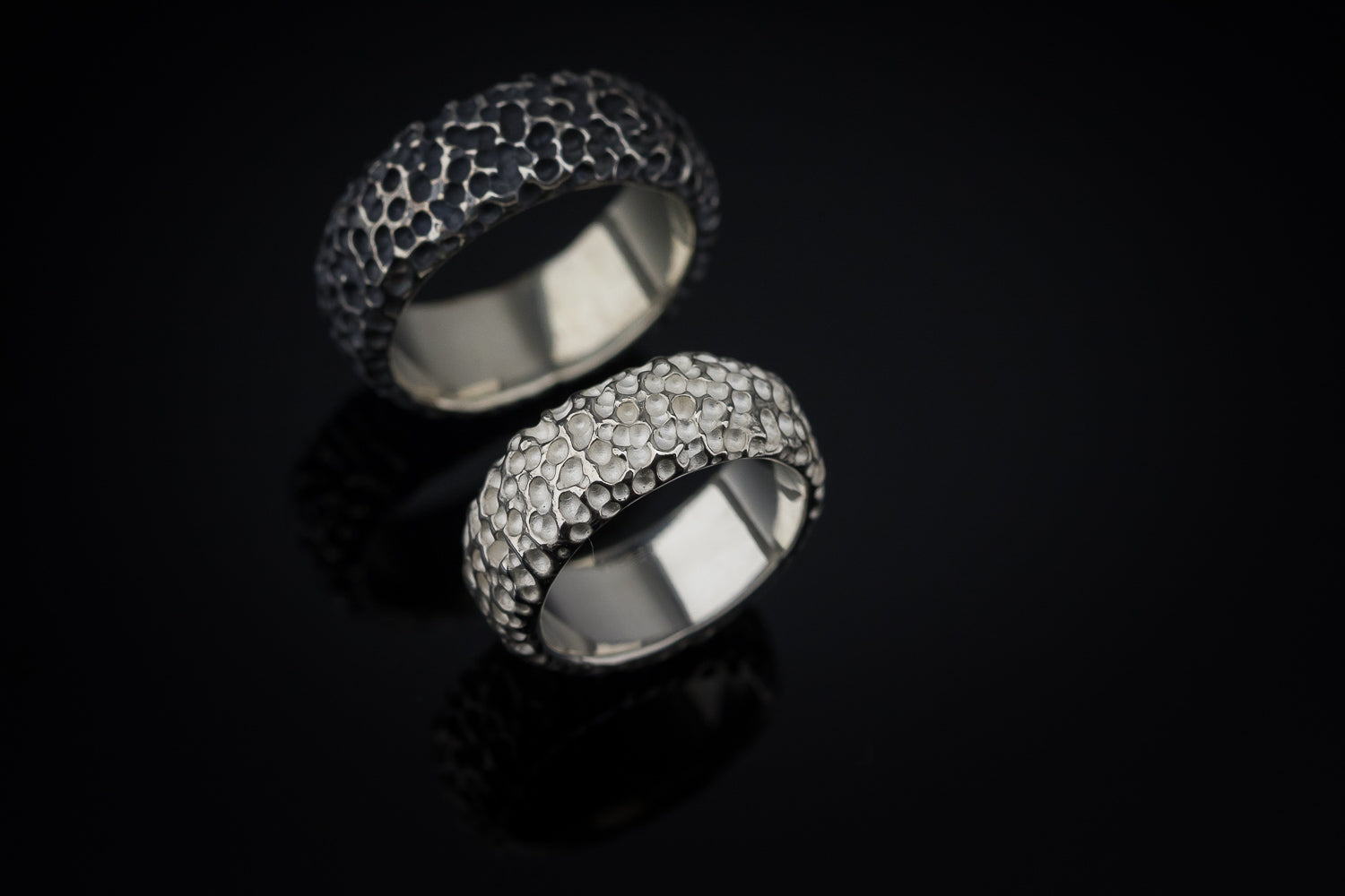 Šie vestuviniai žiedai pagaminti iš sidabro. Žiedus jungia bendra tekstūra, bet tuo pačiu yra ir labai skirtingi. Juoda ir balta - dvi priešingos spalvos. Žmonių taip pat būna labai skirtingų, bet, net ir būdami labai skirtingi, sugebame mylėti ir būti laimingi kartu.