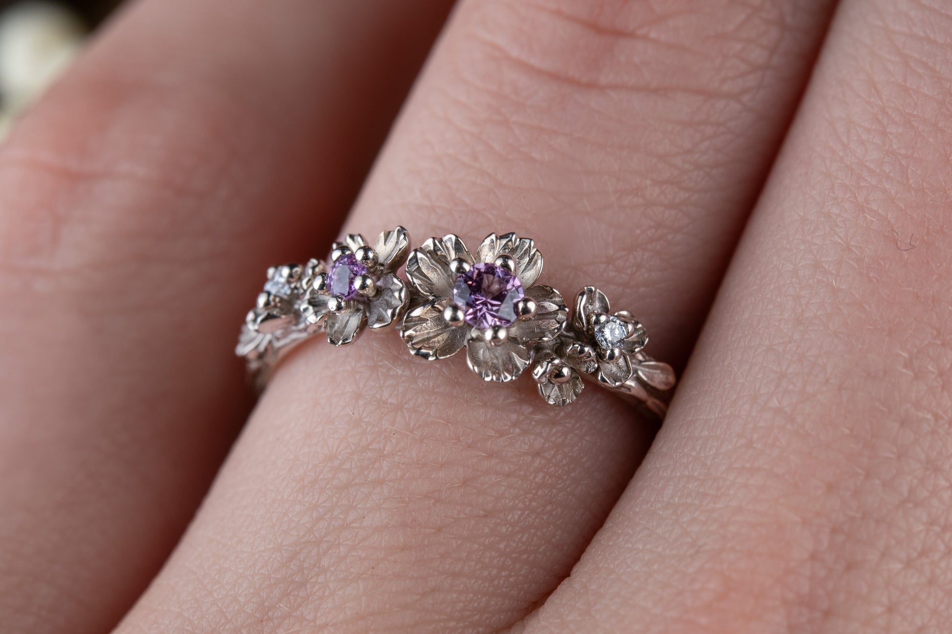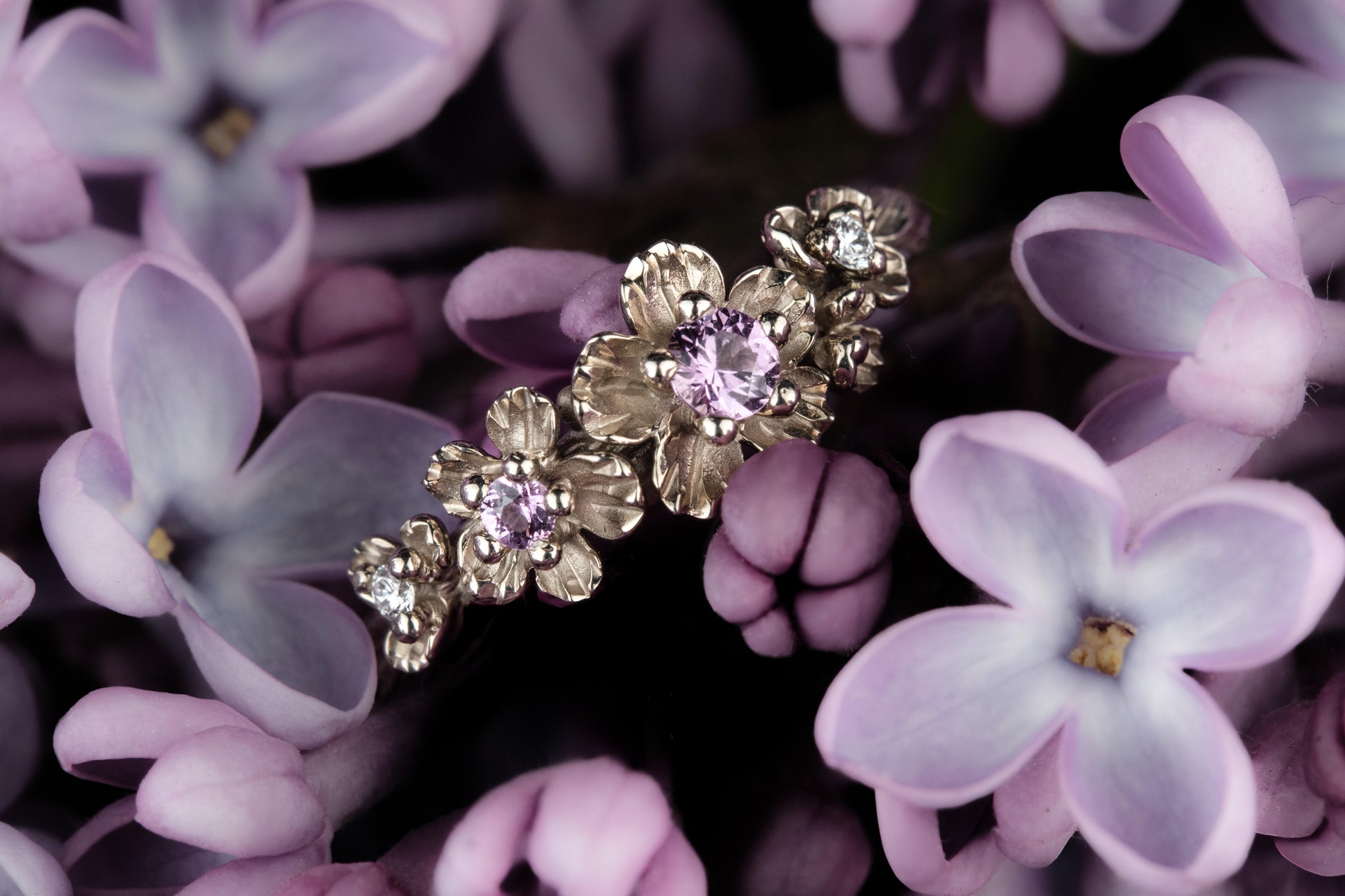 Vienetinis balto aukso žiedas, puoštas rožiniais safyrais ir deimantais. Gėlių motyvais dekoruota žiedo juosta sukuria švelnų, moterišką įvaizdį. Autorinis, rankų darbo dizainas yra įkvėptas pavasarį žydinčių vyšnių. Žiedo autorė - Reda Baranauskaitė.